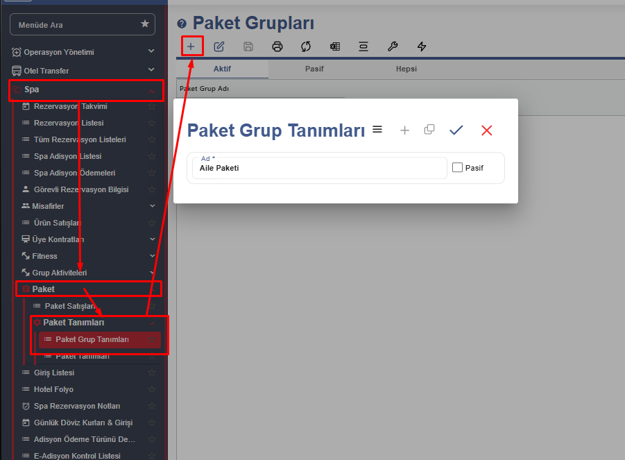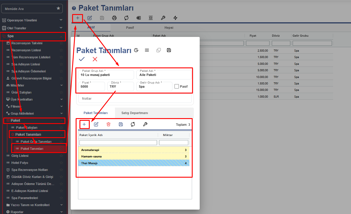 Paket satışı yapabilmek için öncelikle sisteme paketlerimizi tanımlamamız gerekiyor. Bu ekranda paket adını fiyatını ve döviz birimini girdikten sonra alt tarafta bulunan paket tanımları alanından hizmetlerimizi ekliyoruz ve kayıt ediyoruz.