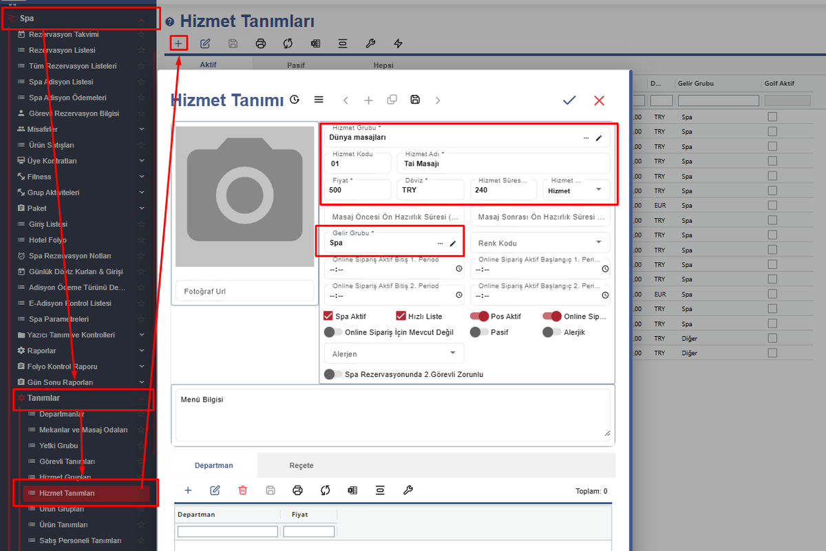 Hizmet tanımlarımızda masajları tanımlıyoruz. Öncelikle hizmet grubu daha sonra hizmet adını fiyat ve döviz vb gibi tanımları doldurduktan sonra kayıt ediyoruz ve hizmetimizi eklemiş oluyoruz.