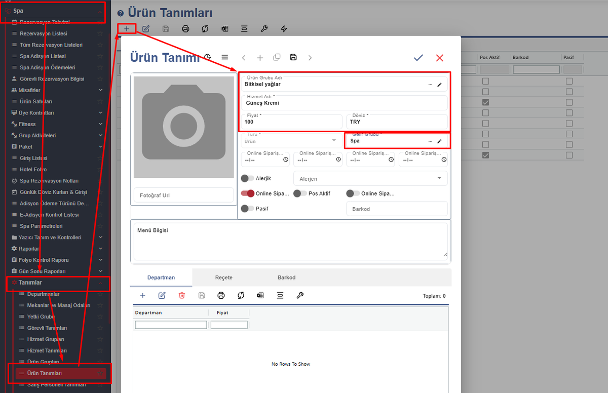 Spa'da aynı zamanda ürün satışı da yapılabilmektedir. Ürün grubunu tanımladıktan sonra ürün tanımı ekranından (+) simgesine tıklayıp satışını yapacağımız ürünleri ekleyebiliriz.